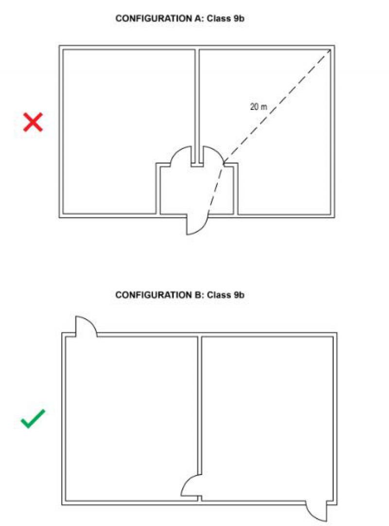 In Configuration B a second exit is provided to satisfy D1.2(d)(vi). A door is provided between the two classrooms because D1.2(g)(ii) requires all occupants of a storey to have access to at least two exits if two or more exits are required. Further, on account of D1.5, the two required exits are at least 9 m apart and distributed evenly around the storey. Configuration B does comply for this scenario.